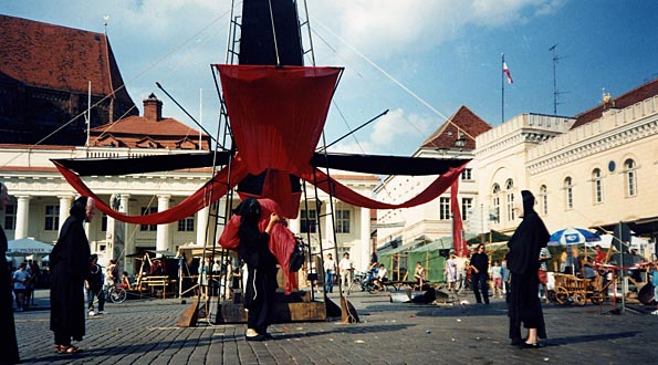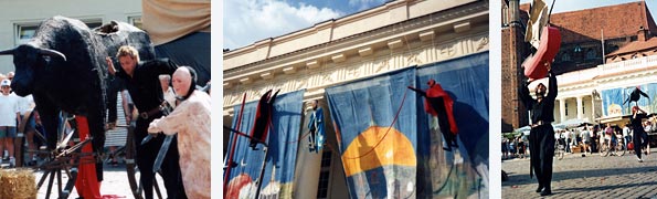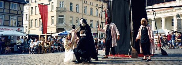 Löwenspektakel anlässlich des 800. Todestages Heinrich des Löwen, innerhalb »1000 Jahre Mecklenburg« 1995 Konzeption, Organisation, Gesamtleitung Auftrag: Land Mecklenburg, Schwerin Mecklenburg, 1995 Mit einem großen Spektakel wurde auf dem Marktplatz der Stadt Schwerin unter Einbeziehung der anrainenden Häuser und des Doms des 800. Todestages Heinrich des Löwen gedacht. ![]() Für die Veranstaltung gab es bundesweit eine Ausschreibung und es waren am Ende vor allem meine Zeichnungen zu meiner Idee, die die Juroren überzeugten. Zu Recht gab es jedoch große Widerstände gegen die Veranstaltung. Die Wiedervereinigung war noch nicht lange her und es hatten sich hervorragende Gruppen aus Schwerin und Umgebung für die Veranstaltung beworben. Die Jury kam zum größten Teil aus Hamburg und entschied sich nun für einen Regisseur aus dem Westen. Zuvor sollte das Thema im Stadttheater umgesetzt werden. Damals nannte ich es noch »Herr Löwe« und schnitt den Stoff komplett auf eine Theaterinszenierung zu. Als klar war, dass ich für meine Inszenierung den Marktplatz zur Verfügung haben würde, musste ich (bei unverändertem Budget!) komplett umdenken. ![]() Die Bespielung der Häuser und Dächer war wie allzu oft aus versicherungstechnischen Gründen nicht möglich. Ausschließlich das Säulengebäude konnte im Prinzip komplett mit bespielt werden. Da ich für einen solch großen Raum optisch einfach mehr Stoff brauchte, entschied ich mich, die historische Geschichte des Stadtgründers mit der Sage über Heinrich den Löwen zu verschränken. Bei der Recherche fiel mir auf, wie sehr die Sage fast 1:1 aus den Märchen von Tausendundeiner Nacht abgeschrieben worden war. Ich beheimatete die Sage räumlich vor allem vor, um, auf dem Säulengebäude und einem Steg, den ich davor bauen ließ, und ließ für die Platzmitte einen Turm anfertigen, in dem auch der technische Leiter das Geschehen koordinieren konnte. Am Ende der Achse gab die sogenannte Blackbox Raum für die begleitenden Musiker. In Anlehnung an eine asiatische Klangschale, ließ ich das Spektakel eröffnen und beschließen, in dem fünf Akteure mit Axtgriffen die große Glocke des Domes zum Klingen und Anschwellen brachten. Irgendwo her hatte ich ganz viel roten Stoff geschenkt bekommen. In der großen Schlacht Heinrichs öffnete sich der Turm und um den ganzen Platz fielen rote Fahnen von den Masten. Ich hatte unterschätzt, was das für eine Reaktion auslösen könnte. Dort, wo ich gerade die Direkt-Regie der Veranstaltung machte, war früher das Stasi-Hauptquartier gewesen. So waren die roten Fahnen der Startschuss für eine Hand voll Störer, die unter Beifall des Publikums versuchten die Aufführung zu stoppen und das Bühnenbild auseinander zu nehmen. Aber auch hier ist mir im Rückblick ein Skandal lieber als eine langweilige Aufführung und wir sind ohne blaues Auge mit einer den Verhältnissen und Möglichkeiten entsprechenden Aufführung davon gekommen. ![]()