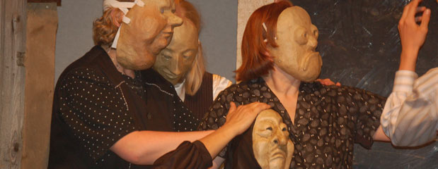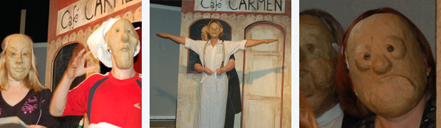 Café Carmen – eine Vollmasken-Oper nach Bizet Jugendhilfeeinrichtung Solveigs Hof Osnabrück 2007 Das »Café Carmen« spielt in einem Hinterhof, in engen Gassen, irgendwo in Andalusien zu einer unbestimmten Zeit. Carmen, eine resolute Wirtin, macht dort ein neues Café auf und wird nun natürlich von allen Seiten – wie es in einem solch kleinen Ort üblich ist – beäugt und beobachtet. Sie verliebt sich, andere verlieben sich in sie und es fehlt ohnehin nicht an Liebesdramen rundherum. Wer am Ende wen bekommt, wird nicht verraten. Das Stück endet nicht, wie in der Oper von Bizet tragisch, sondern mit einem schönen stillen „Happy End“. ![]() An einem etwas abgelegenen Platz im Gewirr verwinkelter und vergilbter andalusischer Gassen, hat Carmen ihr Café eröffnet. Es ist nicht das, was man eine gute Adresse nennt und auch die Gäste kommen eher aus neidischer Neugier, als aus Interesse, in Ruhe einen Kaffee zu trinken und ein Pläuschchen zu halten. Von allen Seiten wird Carmen heimlich beäugt. Für die einen ist die neue junge Wirtin der Inhalt ihrer heimlichsten Träume, für die anderen der Beginn des sittlichen Verfalls. Sie bringt zu viel Bewegung in die mühsam konservierte Ruhe. Intrigen und Heimlichkeiten drohen aufzubrechen, unterdrückte Liebesgefühle zu eskalieren. Und doch wird das Café CARMEN schon bald zum geheimen Mittelpunkt des kleinen Ortes, zu dem jeder seine Hoffnungen trägt und wo die Klänge aus dem Grammophon der resoluten Wirtin für einen Moment die kleinen Sorgen des Alltags und den strengen Moralkondex der konservativen Gemeinde vergessen lassen. Und auch Carmen selbst verschenkt ihr Herz an José und bindet ihn gleich als Koch mit ein. Entkommen unmöglich – für den Moment jedenfalls. Denn als José sich von seiner Verlobten trennt um ganz bei Carmen sein zu können, ist er für sie uninteressant. Sie sucht nach einem „echten Kerl“, den sie in Escamillo, dem stolzen Torrero findet. Josés unbändige Eifersucht ist geweckt und die Geschichte droht ein übles Ende zu nehmen. ![]() Die rasante Verstrickungsgeschichte Mérimées, die Bizet seiner Oper zu Grunde legt, ist in sehr groben Zügen auch der Stoff, aus dem das Ensemble des Solveigs Hofes sein Schauspiel mit Vollmasken schneidert. Eine Oper mit Vollmasken! Schon der offensichtliche Widerspruch bildet den großen Reiz für dieses Sommerspektakel. Trotz vieler komödiantischer Elemente, die die Inszenierung dadurch aufgreift, nimmt sie in sich die Situation und Darstellungsmomente durchgehend ernst, und zollt über die Oper hinaus in den bildlich narrativen Momenten der Erzählung Mérimées im darstellerischen Rahmen einen hohen Respekt. Wieder ist es Jugendlichen und Mitarbeitern der Jugendhilfeeinrichtung gelungen, in ihrer Freizeit unter der Regie von Ulrich Thon eine für den Laienbereich hochwertige Produktion auf die Bühne zu stellen. Auch diesmal sorgt das auf die Tenne speziell zugeschnittene Bühnenbild durch das Gesamtambiente wieder für die Einzigartigkeit der Solveigs-Hof-Produktionen. ![]() Hintergründe unserer Arbeit am »Café Carmen« »Café Carmen – eine Vollmasken-Oper« wurde das fünfte Projekt in der Jugendhilfeeinrichtung Solveigs Hof. Ich hatte mich bewusst für ein Vollmasken-Projekt entschieden, da ich bisher Stücke erarbeitet hatte, deren Schwerpunkt auf der wörtlichen Sprache als Medium lag. Was mir jedoch über die Zeit immer mehr klar wurde war, dass manche der Jugendlichen, die sprachlich nicht so gewandt waren wie ihre Kameraden, in den Theaterstücken unterzugehen drohten. Sie sollten dieses Mal ein Forum bekommen. Ebenso wie bei Peer Gynt bot ich einen Stoff an, von dem ich – aus der Erfahrung in der Jugendhilfe heraus – überzeugt war, dass er mit dem Leben und den in diesem Alter biographischen Erfahrungswerten der Jugendlichen unmittelbar zu tun hatte. Ich verlegte Mérimées Geschichte von Liebe und Eifersucht auf einen kleinen Platz in Spanien und machte Carmen zur Wirtin eines kleinen Cafés, das seine besten Zeiten bereits hinter sich hatte. Hier begegneten sich alte und junge Leute aus dem Dorf. Hier verliebte sich Carmen in ihren neuen Küchenjungen, dem sie später den strahlenden Torero vorzog. Und hier spielt sich auch eine rührende Liebesgeschichte zwischen zwei älteren Leuten ab, die nicht öffentlich werden darf. Alles in Allem folgten wir den Gesetzmäßigkeiten der Commedia dell’Arte, nur mit dem Unterschied, dass wir auf gesprochene Sprache verzichteten. ![]() Masken: Ulrich Thon Eine Herkules-Arbeit stellte die Herstellung der Masken dar, da ich darauf bestand, sie selber zu bauen. Dies hatte unterschiedliche Gründe, zuvorderst, dass ich neben der Probenarbeit den Jugendlichen unmöglich abverlangen konnte, noch um die dreißig Stunden für ihre Masken aufzuwenden. Zum anderen war mir wichtig, dass die Masken in guter Weise harmonierten und nicht die Situation entstehen konnte, dass wieder ein Teil der Gruppe mit besonders kunstvollen Masken „glänzte“, die einem anderen Teil in dieser Weise sicherlich nicht gelungen wären. Der unausgesprochene Hauptanspruch von mir jedoch war, Masken zu fertigen, die mit dem jeweiligen Maskenspieler zu tun hatten. Da ich nun die Gruppe über mehrere Projekte hinweg hatte kennen lernen dürfen, kannte ich im Grunde ihre Stärken und Schwächen, ihre inneren und äußeren Auseinandersetzungen und konnte dieses Wissen zum Ausgangspunkt meiner Überlegungen machen. Also versuchte ich, Charakterzüge der Spielerinnen und Spieler so aufzugreifen, dass sie durch einen Gegenpol der Masken in ihrer Körpersprache gegen Alltagsgewohnheiten anspielen mussten; oder anders, ich versuchte etwas, was ich innen vermutete, außen anzulegen. Durch die spielerische Auseinandersetzung (mit sich selbst) sollten verschiedene Aspekte in Einklang für eine körperliche Bühnensprache gebracht werden. In diesem Fall war mir jedoch auch wichtig, dass dieser Prozess in einem vordergründig kummerlosen 