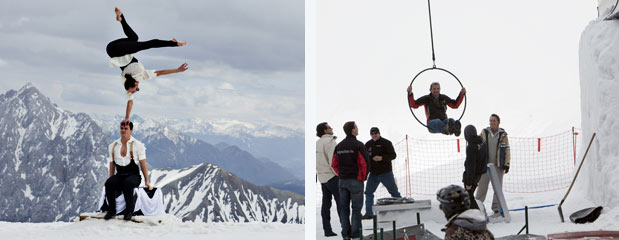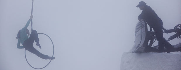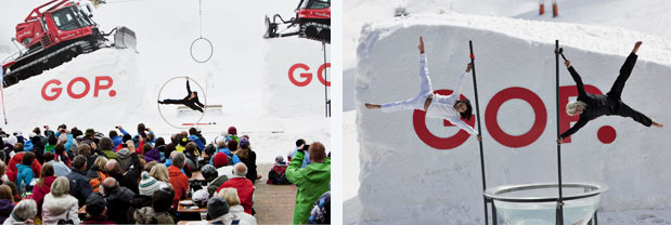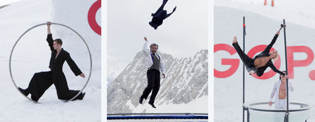 Nach den Inszenierungen auf dem Urlaubs-Liner „Mein Schiff 1“ und dem Auftritt während eines Linienfluges, wagte sich das GOP Varieté mit seiner Aktion „Varieté im Schnee“ auf den höchsten Berg Deutschlands. Zwei Dinge waren abzusehen: Traumhaft schöne Motive und die Unberechenbarkeit der Berge.