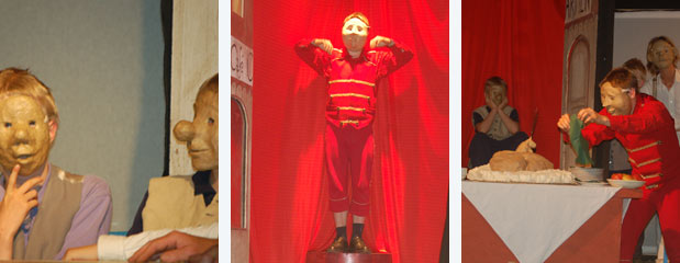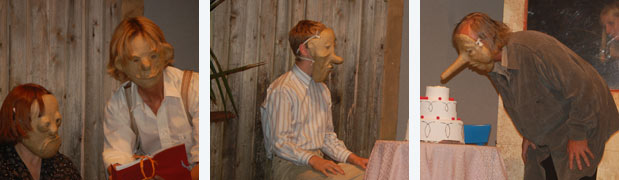 Café Carmen – eine Vollmasken-Oper nach Bizet Jugendhilfeeinrichtung Solveigs Hof Osnabrück 2007 Das »Café Carmen« spielt in einem Hinterhof, in engen Gassen, irgendwo in Andalusien zu einer unbestimmten Zeit. Carmen, eine resolute Wirtin, macht dort ein neues Café auf und wird nun natürlich von allen Seiten – wie es in einem solch kleinen Ort üblich ist – beäugt und beobachtet. Sie verliebt sich, andere verlieben sich in sie und es fehlt ohnehin nicht an Liebesdramen rundherum. Wer am Ende wen bekommt, wird nicht verraten. Das Stück endet nicht, wie in der Oper von Bizet tragisch, sondern mit einem schönen stillen „Happy End“. ![]() An einem etwas abgelegenen Platz im Gewirr verwinkelter und vergilbter andalusischer Gassen, hat Carmen ihr Café eröffnet. Es ist nicht das, was man eine gute Adresse nennt und auch die Gäste kommen eher aus neidischer Neugier, als aus Interesse, in Ruhe einen Kaffee zu trinken und ein Pläuschchen zu halten. Von allen Seiten wird Carmen heimlich beäugt. Für die einen ist die neue junge Wirtin der Inhalt ihrer heimlichsten Träume, für die anderen der Beginn des sittlichen Verfalls. Sie bringt zu viel Bewegung in die mühsam konservierte Ruhe. Intrigen und Heimlichkeiten drohen aufzubrechen, unterdrückte Liebesgefühle zu eskalieren. Und doch wird das Café CARMEN schon bald zum geheimen Mittelpunkt des kleinen Ortes, zu dem jeder seine Hoffnungen trägt und wo die Klänge aus dem Grammophon der resoluten Wirtin für einen Moment die kleinen Sorgen des Alltags und den strengen Moralkondex der konservativen Gemeinde vergessen lassen. Und auch Carmen selbst verschenkt ihr Herz an José und bindet ihn gleich als Koch mit ein. Entkommen unmöglich – für den Moment jedenfalls. Denn als José sich von seiner Verlobten trennt um ganz bei Carmen sein zu können, ist er für sie uninteressant. Sie sucht nach einem „echten Kerl“, den sie in Escamillo, dem stolzen Torrero findet. Josés unbändige Eifersucht ist geweckt und die Geschichte droht ein übles Ende zu nehmen. ![]() Die rasante Verstrickungsgeschichte Mérimées, die Bizet seiner Oper zu Grunde legt, ist in sehr groben Zügen auch der Stoff, aus dem das Ensemble des Solveigs Hofes sein Schauspiel mit Vollmasken schneidert. Eine Oper mit Vollmasken! Schon der offensichtliche Widerspruch bildet den großen Reiz für dieses Sommerspektakel. Trotz vieler komödiantischer Elemente, die die Inszenierung dadurch aufgreift, nimmt sie in sich die Situation und Darstellungsmomente durchgehend ernst, und zollt über die Oper hinaus in den bildlich narrativen Momenten der Erzählung Mérimées im darstellerischen Rahmen einen hohen Respekt. Wieder ist es Jugendlichen und Mitarbeitern der Jugendhilfeeinrichtung gelungen, in ihrer Freizeit unter der Regie von Ulrich Thon eine für den Laienbereich hochwertige Produktion auf die Bühne zu stellen. Auch diesmal sorgt das auf die Tenne speziell zugeschnittene Bühnenbild durch das Gesamtambiente wieder für die Einzigartigkeit der Solveigs-Hof-Produktionen. ![]() Hintergründe unserer Arbeit am »Café Carmen« »Café Carmen – eine Vollmasken-Oper« wurde das fünfte Projekt in der Jugendhilfeeinrichtung Solveigs Hof. Ich hatte mich bewusst für ein Vollmasken-Projekt entschieden, da ich bisher Stücke erarbeitet hatte, deren Schwerpunkt auf der wörtlichen Sprache als Medium lag. Was mir jedoch über die Zeit immer mehr klar wurde war, dass manche der Jugendlichen, die sprachlich nicht so gewandt waren wie ihre Kameraden, in den Theaterstücken unterzugehen drohten. Sie sollten dieses Mal ein Forum bekommen. Ebenso wie bei Peer Gynt bot ich einen Stoff an, von dem ich – aus der Erfahrung in der Jugendhilfe heraus – überzeugt war, dass er mit dem Leben und den in diesem Alter biographischen Erfahrungswerten der Jugendlichen unmittelbar zu tun hatte. Ich verlegte Mérimées Geschichte von Liebe und Eifersucht auf einen kleinen Platz in Spanien und machte Carmen zur Wirtin eines kleinen Cafés, das seine besten Zeiten bereits hinter sich hatte. Hier begegneten sich alte und junge Leute aus dem Dorf. Hier verliebte sich Carmen in ihren neuen Küchenjungen, dem sie später den strahlenden Torero vorzog. Und hier spielt sich auch eine rührende Liebesgeschichte zwischen zwei älteren Leuten ab, die nicht öffentlich werden darf. Alles in Allem folgten wir den Gesetzmäßigkeiten der Commedia dell’Arte, nur mit dem Unterschied, dass wir auf gesprochene Sprache verzichteten. ![]() Masken: Ulrich Thon Eine Herkules-Arbeit stellte die Herstellung der Masken dar, da ich darauf bestand, sie selber zu bauen. Dies hatte unterschiedliche Gründe, zuvorderst, dass ich neben der Probenarbeit den Jugendlichen unmöglich abverlangen konnte, noch um die dreißig Stunden für ihre Masken aufzuwenden. Zum anderen war mir wichtig, dass die Masken in guter Weise harmonierten und nicht die Situation entstehen konnte, dass wieder ein Teil der Gruppe mit besonders kunstvollen Masken „glänzte“, die einem anderen Teil in dieser Weise sicherlich nicht gelungen wären. Der unausgesprochene Hauptanspruch von mir jedoch war, Masken zu fertigen, die mit dem jeweiligen Maskenspieler zu tun hatten. Da ich nun die Gruppe über mehrere Projekte hinweg hatte kennen lernen dürfen, kannte ich im Grunde ihre Stärken und Schwächen, ihre inneren und äußeren Auseinandersetzungen und konnte dieses Wissen zum Ausgangspunkt meiner Überlegungen machen. Also versuchte ich, Charakterzüge der Spielerinnen und Spieler so aufzugreifen, dass sie durch einen Gegenpol der Masken in ihrer Körpersprache gegen Alltagsgewohnheiten anspielen mussten; oder anders, ich versuchte etwas, was ich innen vermutete, außen anzulegen. Durch die spielerische Auseinandersetzung (mit sich selbst) sollten verschiedene Aspekte in Einklang für eine körperliche Bühnensprache gebracht werden. In diesem Fall war mir jedoch auch wichtig, dass dieser Prozess in einem vordergründig kummerlosen 